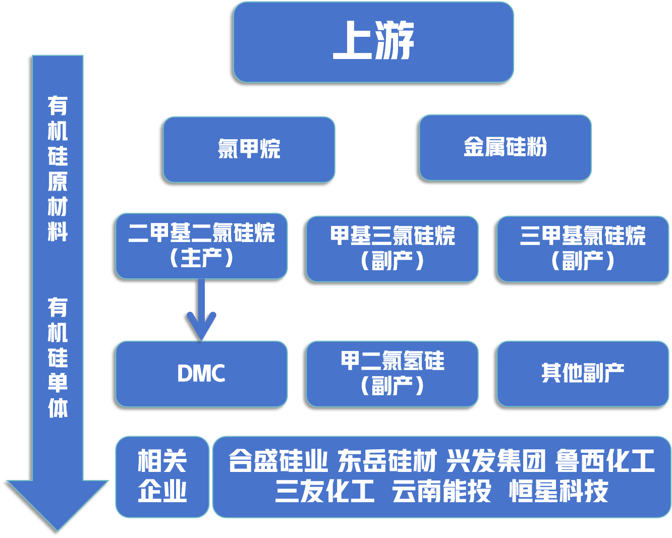 有机硅产业链分为上游、中游和下游三个环节。